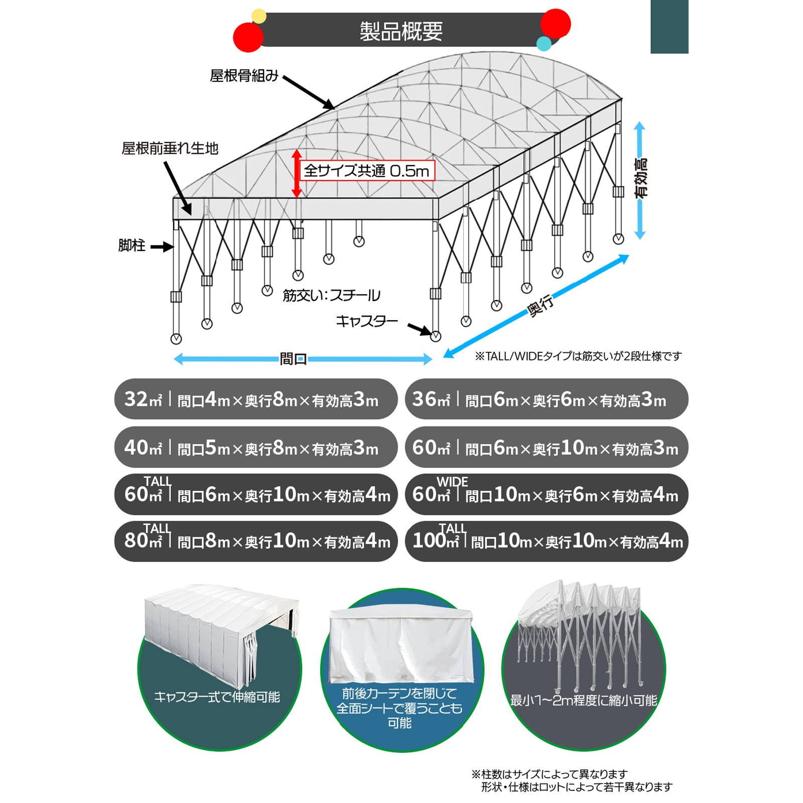 32㎡:間口4m*奥行き8m*有効高3m 36㎡:間口6m*奥行き6m*有効高3m 40㎡:間口5m*奥行き8m*有効高3m 60㎡:間口6m*奥行き10m*有効高3m 60㎡TALL:間口6m*奥行き10m*有効高4m 60㎡WIDE:間口10m*奥行き6m*有効高4m 80㎡TALL:間口8m*奥行き10m*有効高4m 100㎡TALL:間口10m*奥行き10m*有効高4m |